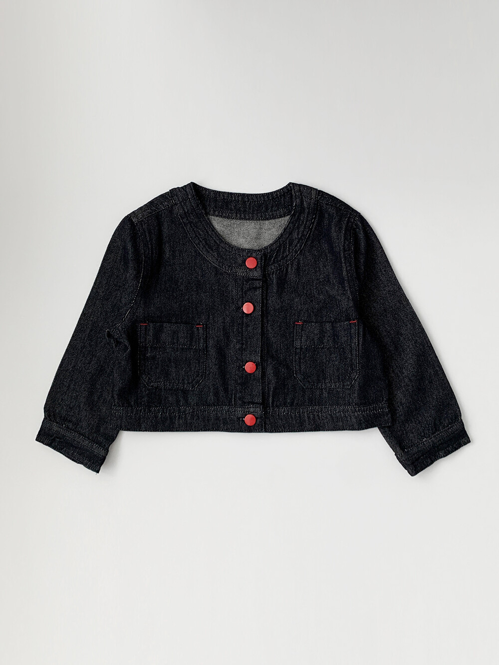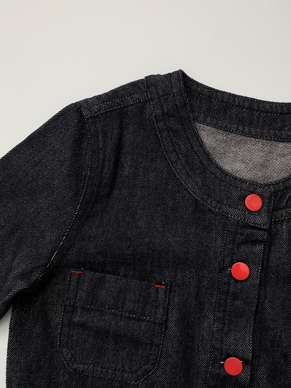 차분한 딥 블루 생지 데님 위에 레드 컬러 버튼으로 확실한 포인트를 주었어요