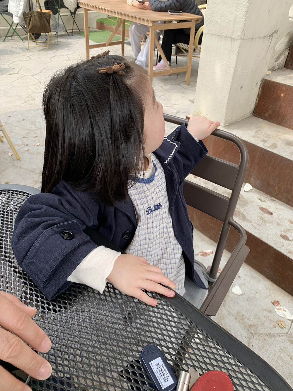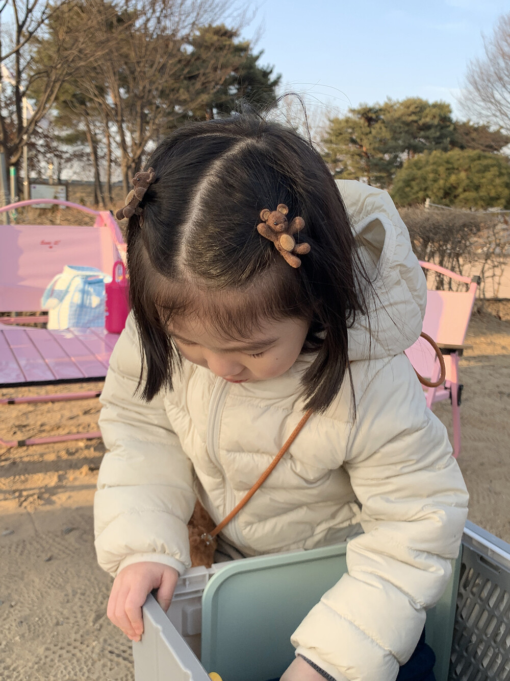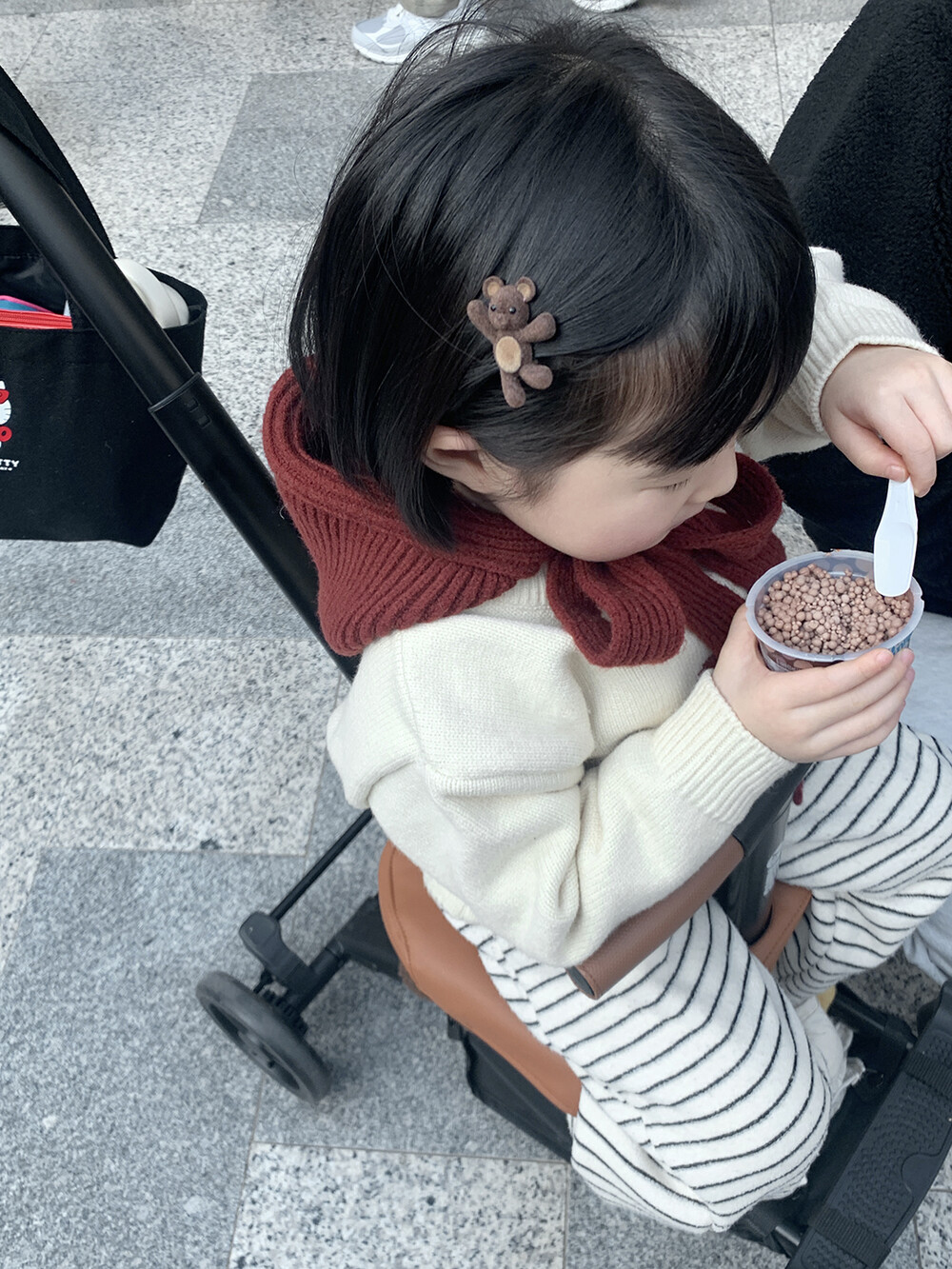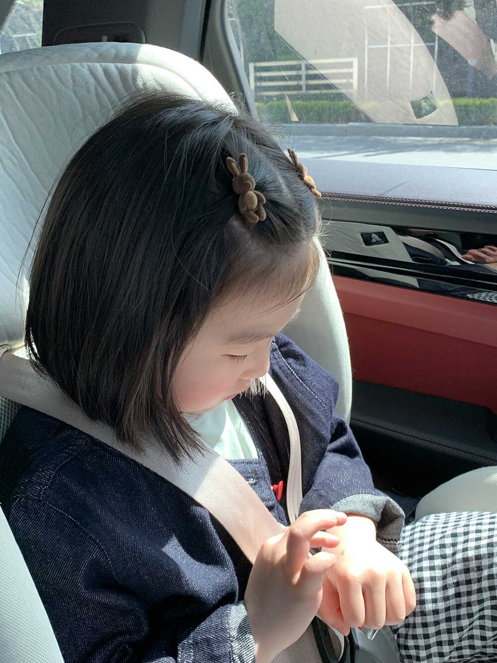 포근한 브라운 컬러의 미니 곰돌이가 아이 머리 위에