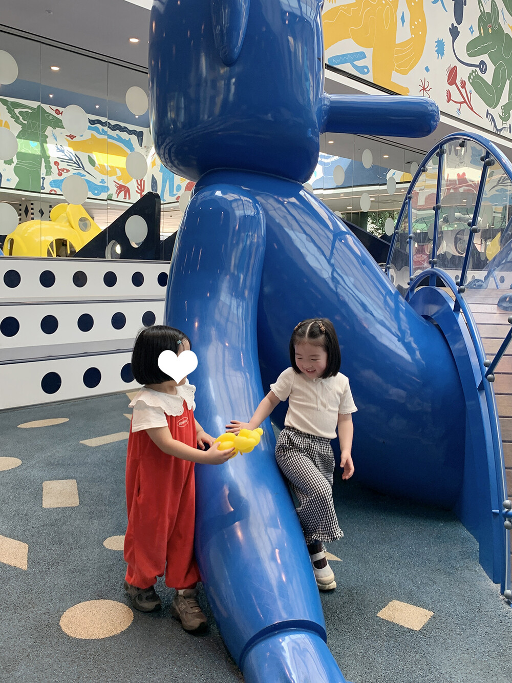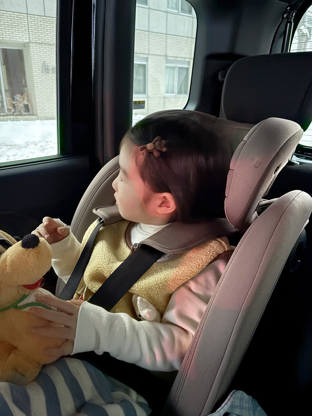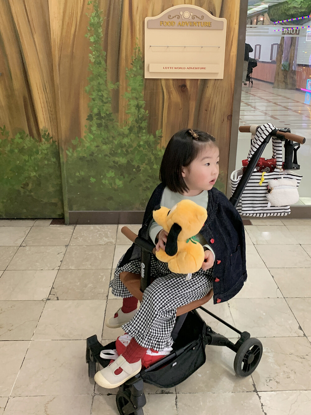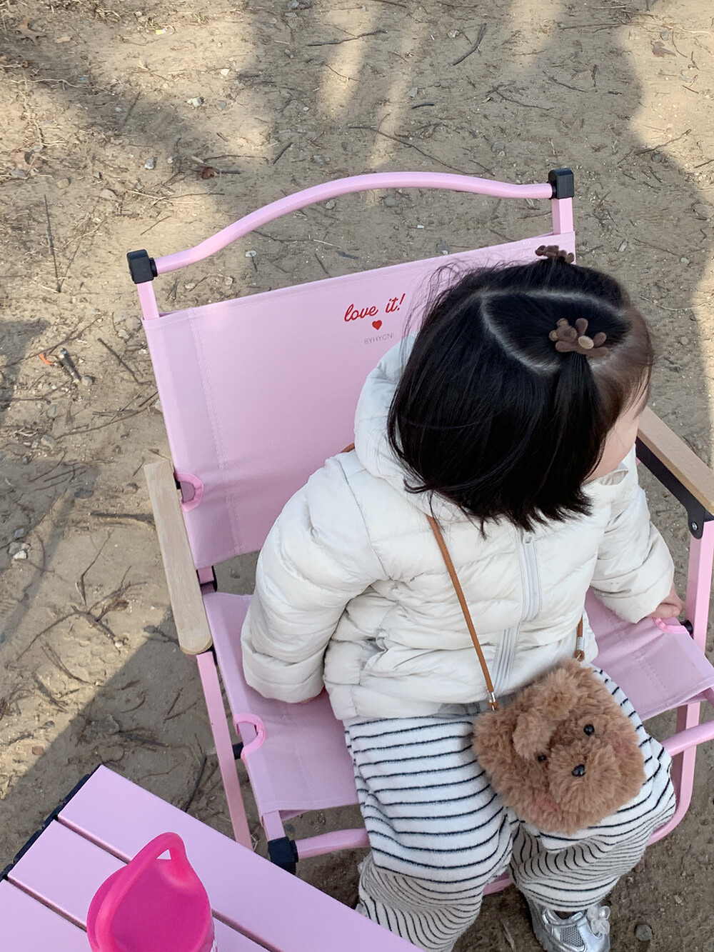포근한 브라운 컬러의 미니 곰돌이가 아이 머리 위에