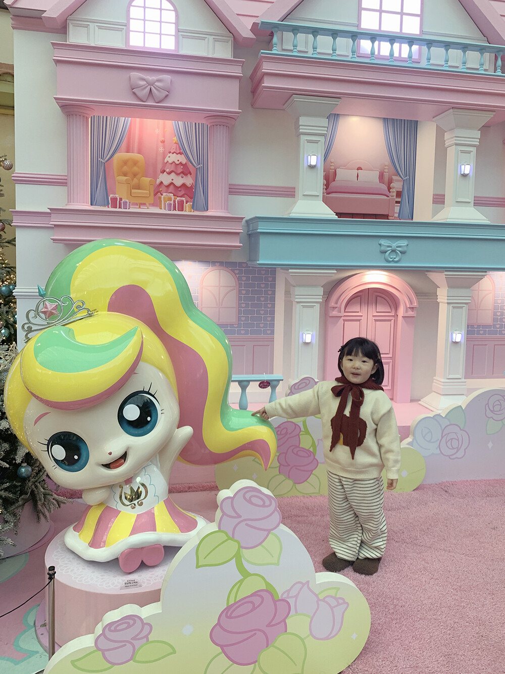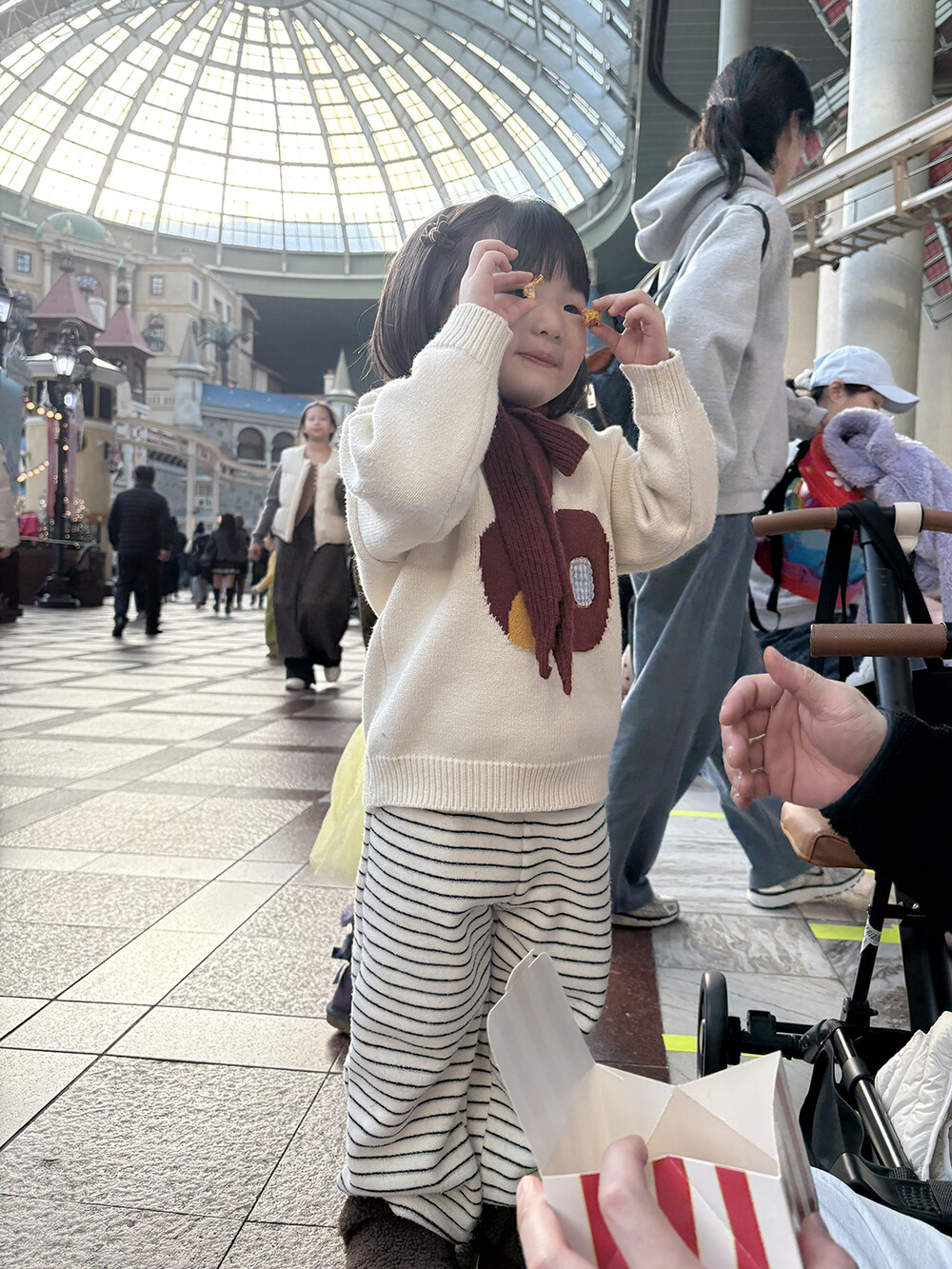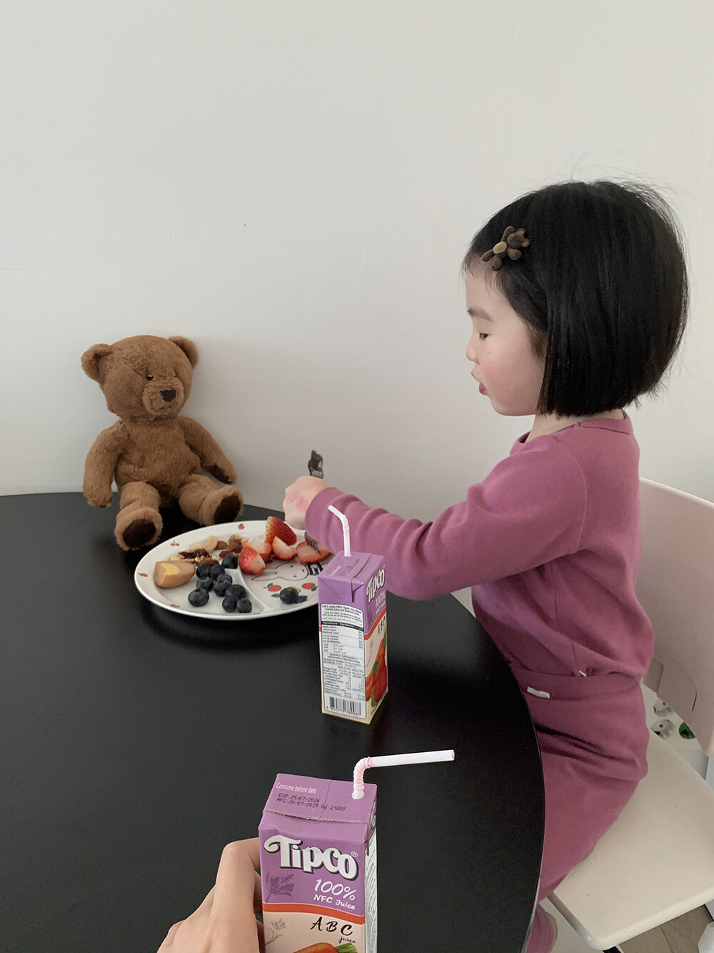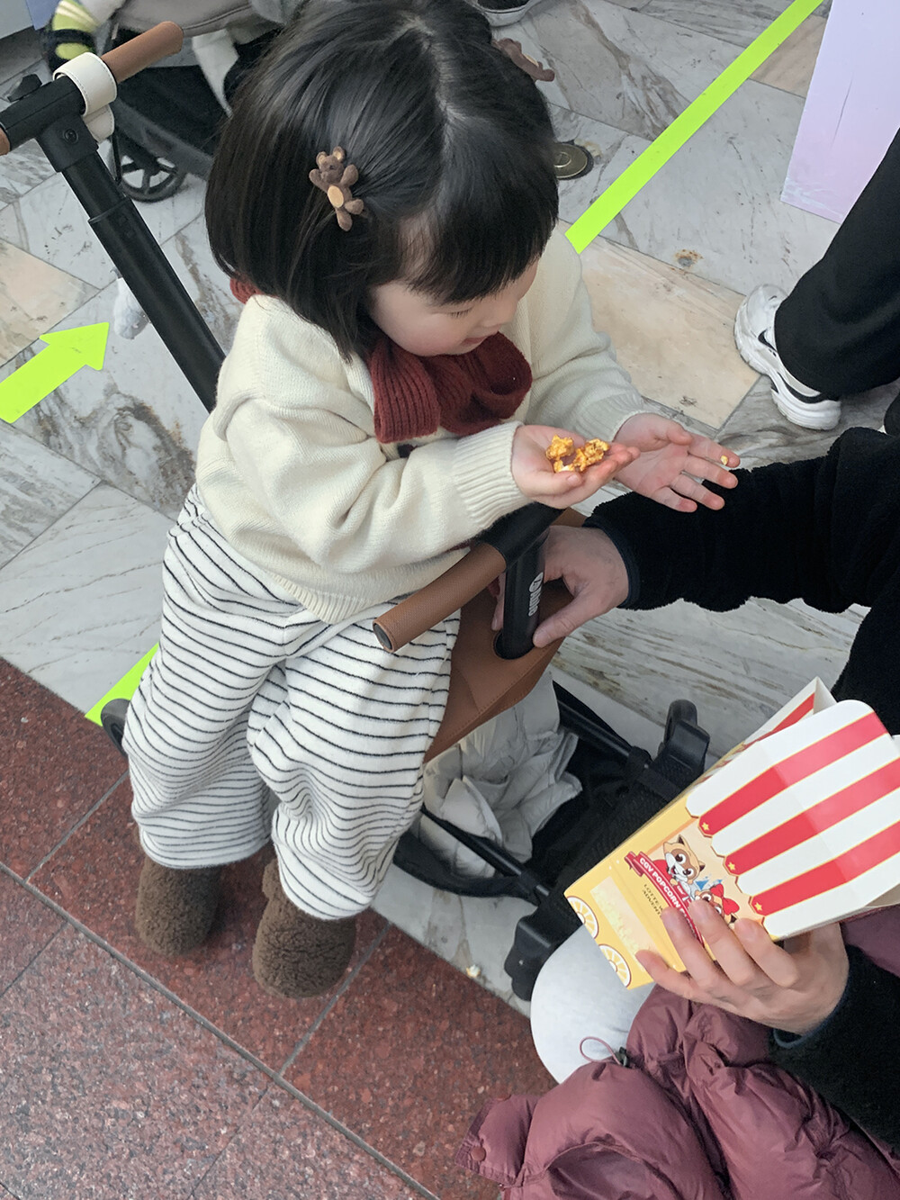 포근한 브라운 컬러의 미니 곰돌이가 아이 머리 위에