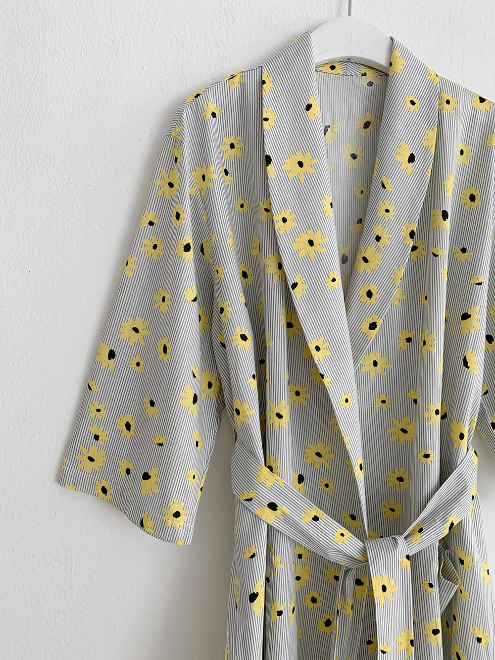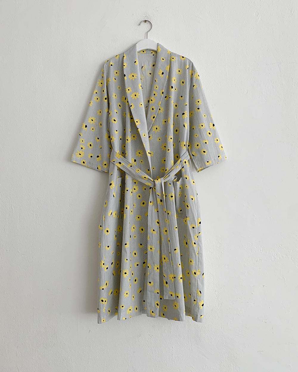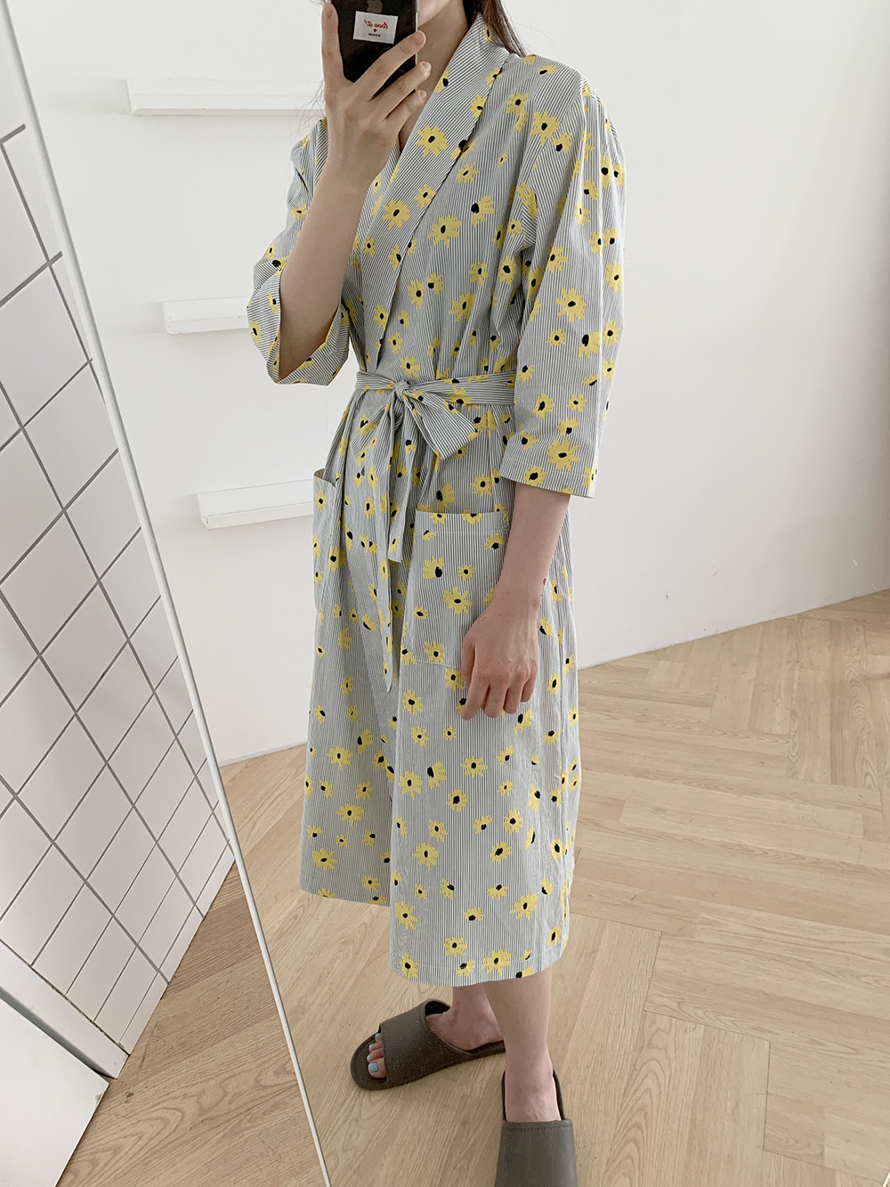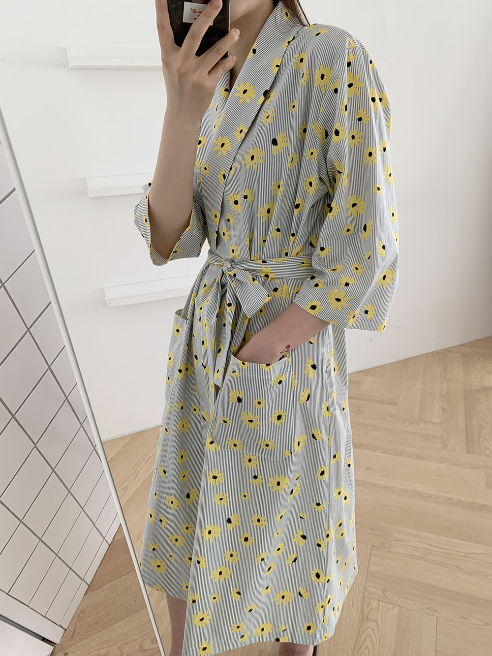 샤워하고 간단히 물기닦구 슥 입고싶었던 나의 로망.. 로브 가운 보여드려요♥♥ 앞전에 보여드린 파자마 팬츠와 같은 원단으로 세트로 연출해주셔도 좋구요 로브 그대로 클로징하여 원피스로 다양하게 활용하기 좋으실 거예요 부드럽고 보송한 면 100 소재로 피부 민감하신 분들도 아주 편안하게 입으실 수 있구요 잔잔한 스트라이프 패턴에 화사한 옐로우 플라워 패턴으로 얼굴빛을 너무 예쁘게 살려주어요 그리고 따로 롤업을 하지않아도 간편하게 세안하시거나 생활하실 수 있도록 7부 소매로 디자인 되었어요 또한 루즈한 핏으로 여리여리한 무드는 덤으로 드릴거예요 바지와 달리 좀더 탄탄한 느낌을 주기위해 덧댐 원단과 클래식한 무드의 카라디자인이 더해져 지극히 개인적으로 한여름엔 더울것 같구요 봄, 초여름, 가을 정말 활용도 높게 입기 좋아요 소장가치 높은 아이템으로 추천드릴게요 :)