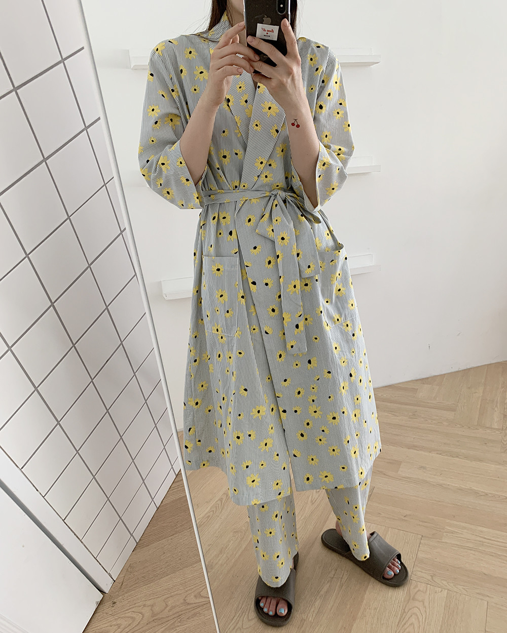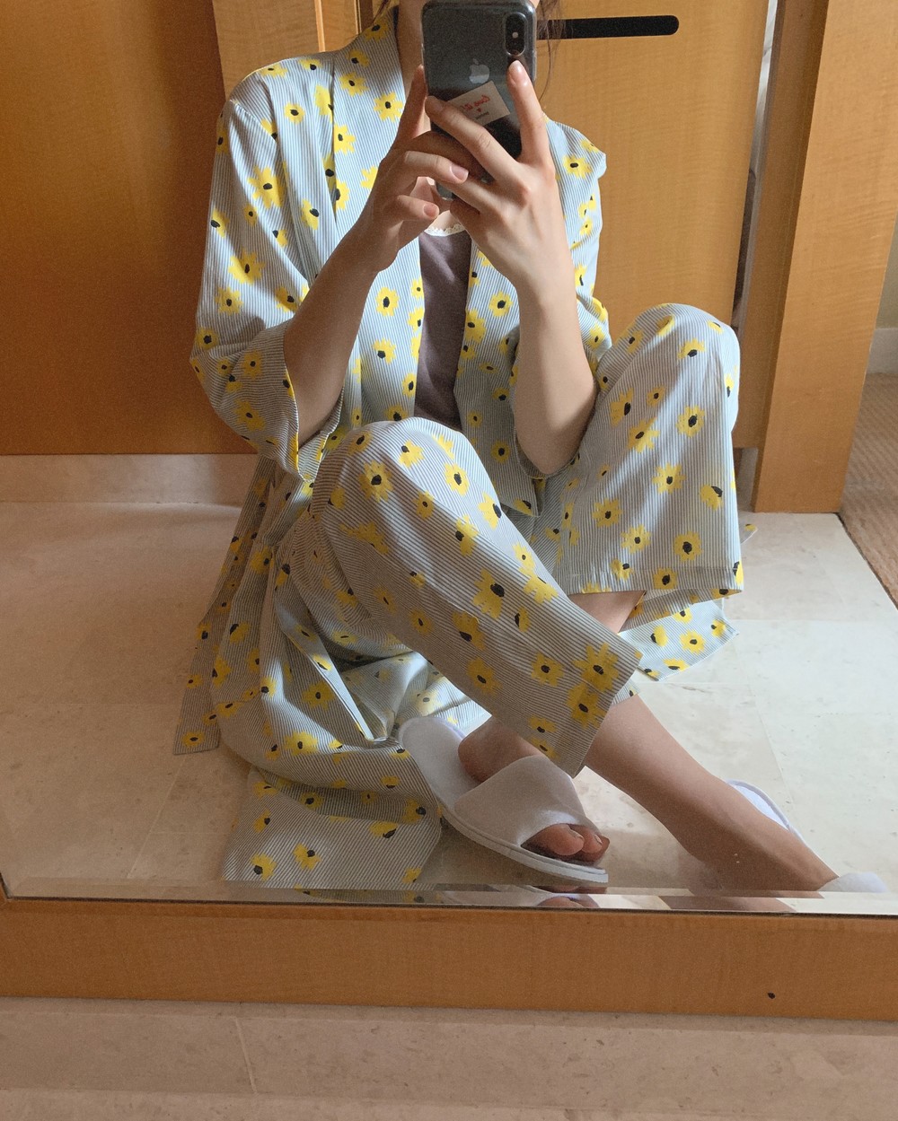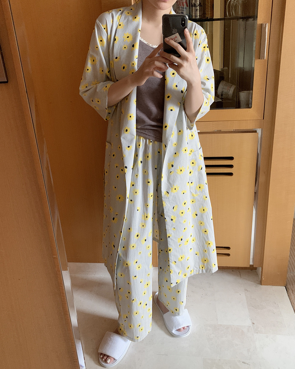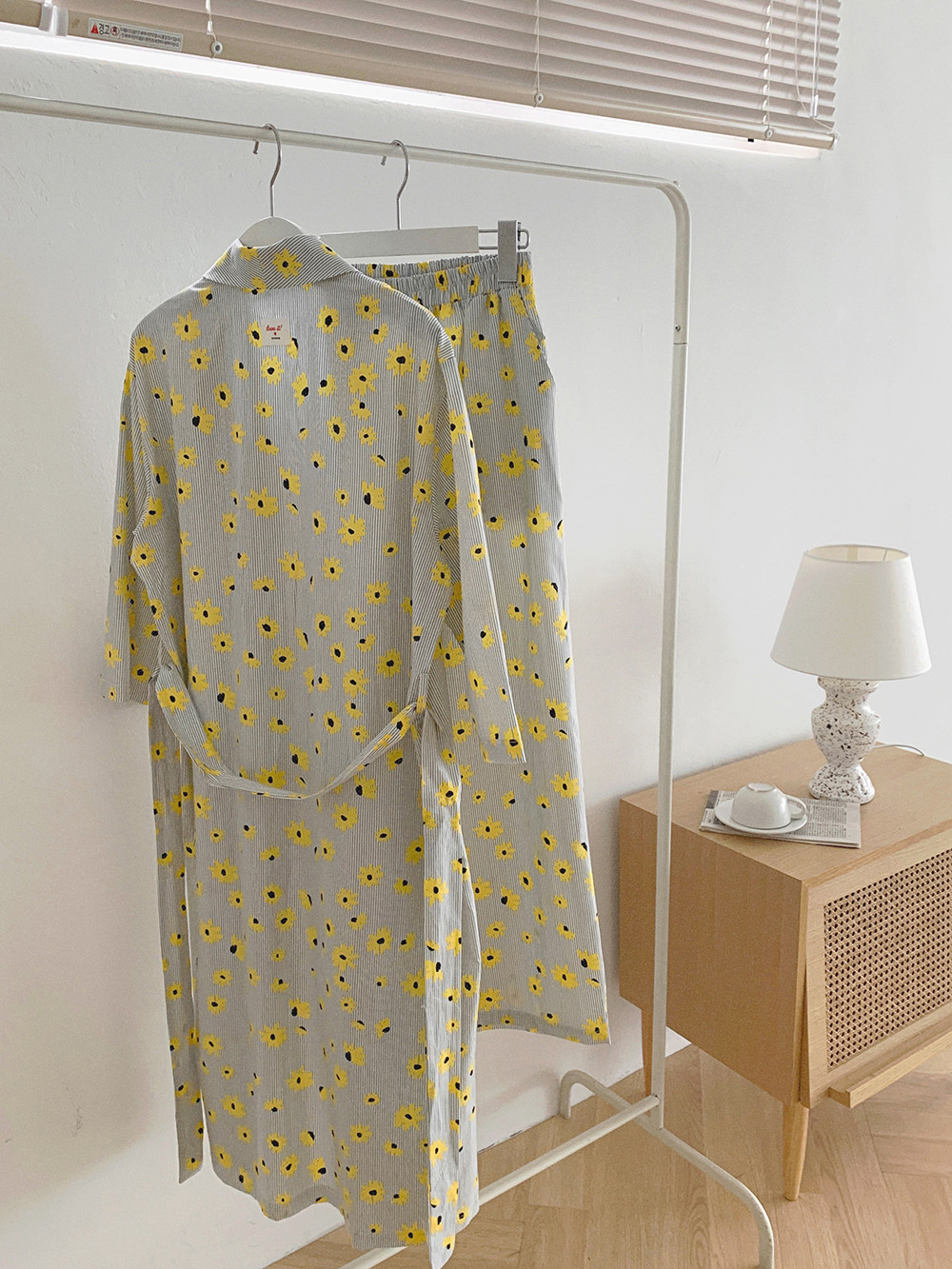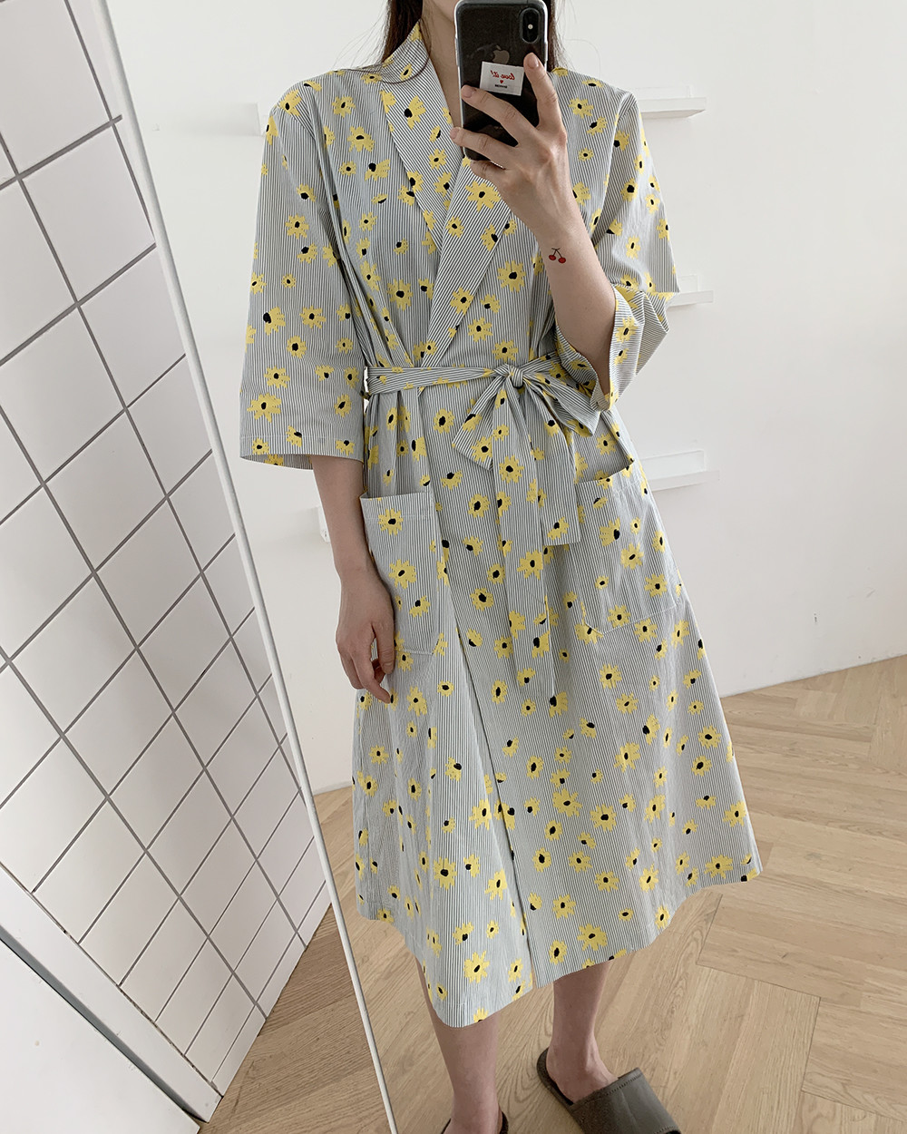 샤워하고 간단히 물기닦구 슥 입고싶었던 나의 로망.. 로브 가운 보여드려요♥♥ 앞전에 보여드린 파자마 팬츠와 같은 원단으로 세트로 연출해주셔도 좋구요 로브 그대로 클로징하여 원피스로 다양하게 활용하기 좋으실 거예요 부드럽고 보송한 면 100 소재로 피부 민감하신 분들도 아주 편안하게 입으실 수 있구요 잔잔한 스트라이프 패턴에 화사한 옐로우 플라워 패턴으로 얼굴빛을 너무 예쁘게 살려주어요 그리고 따로 롤업을 하지않아도 간편하게 세안하시거나 생활하실 수 있도록 7부 소매로 디자인 되었어요 또한 루즈한 핏으로 여리여리한 무드는 덤으로 드릴거예요 바지와 달리 좀더 탄탄한 느낌을 주기위해 덧댐 원단과 클래식한 무드의 카라디자인이 더해져 지극히 개인적으로 한여름엔 더울것 같구요 봄, 초여름, 가을 정말 활용도 높게 입기 좋아요 소장가치 높은 아이템으로 추천드릴게요 :)