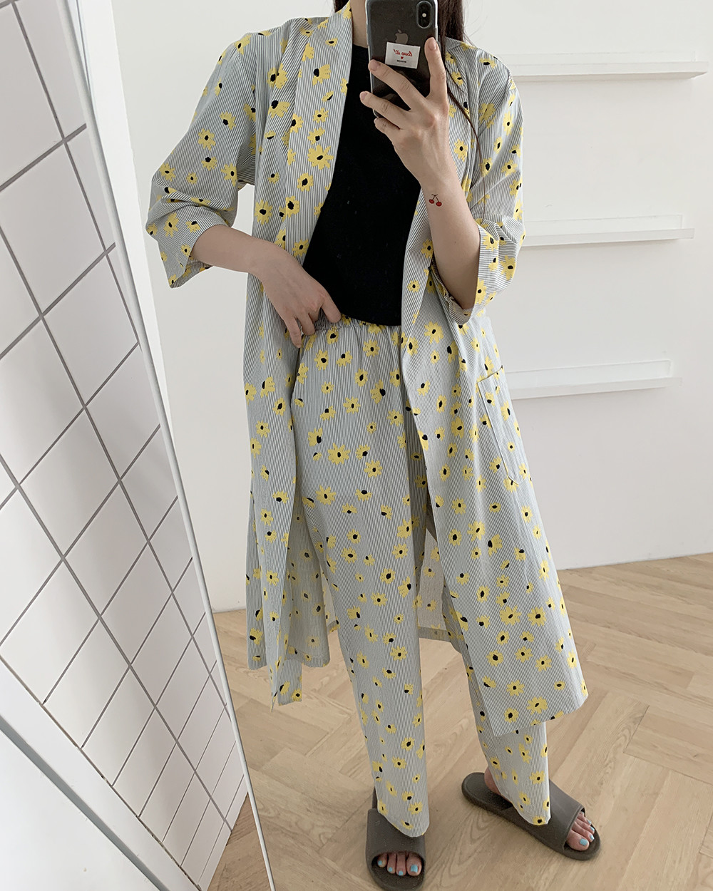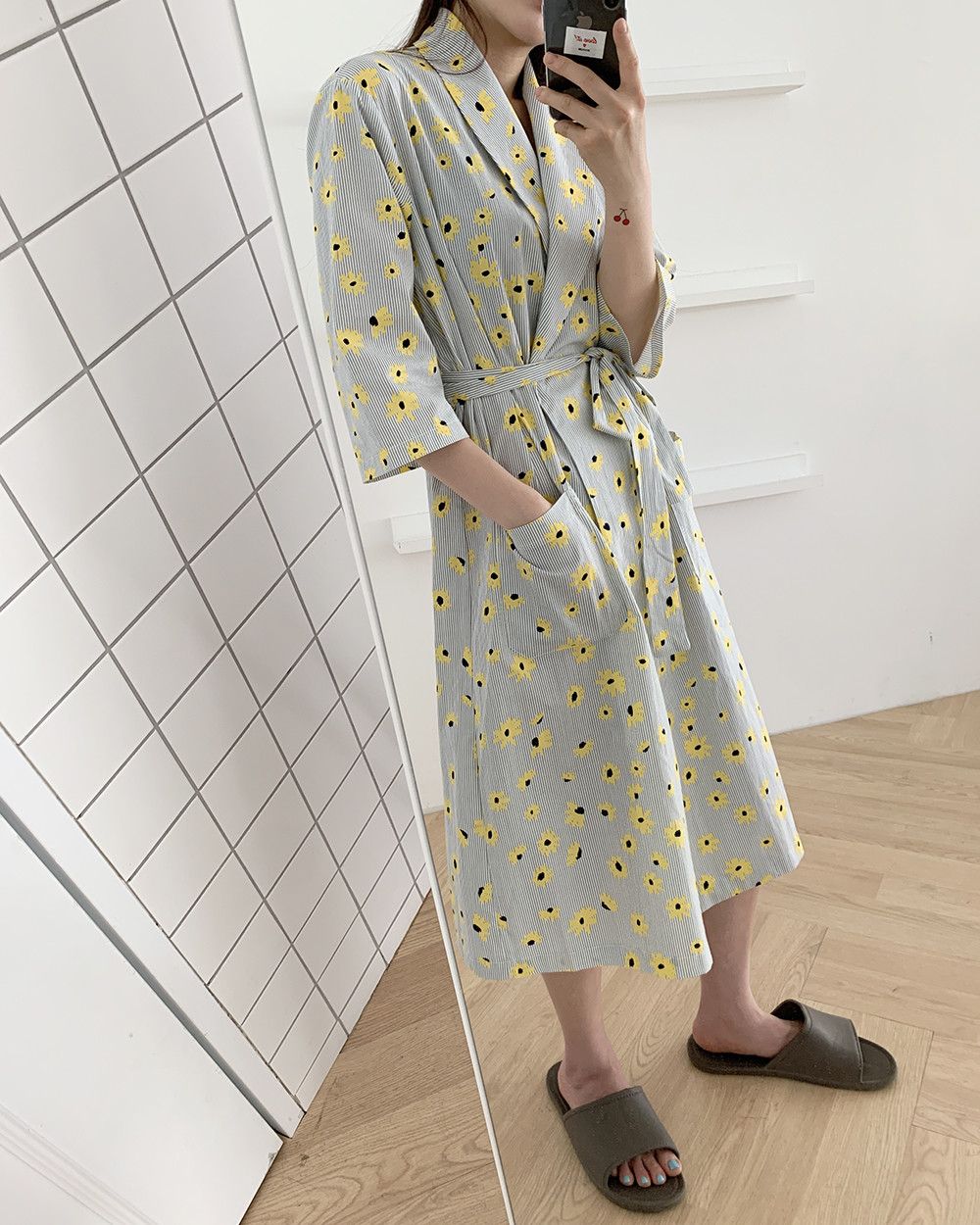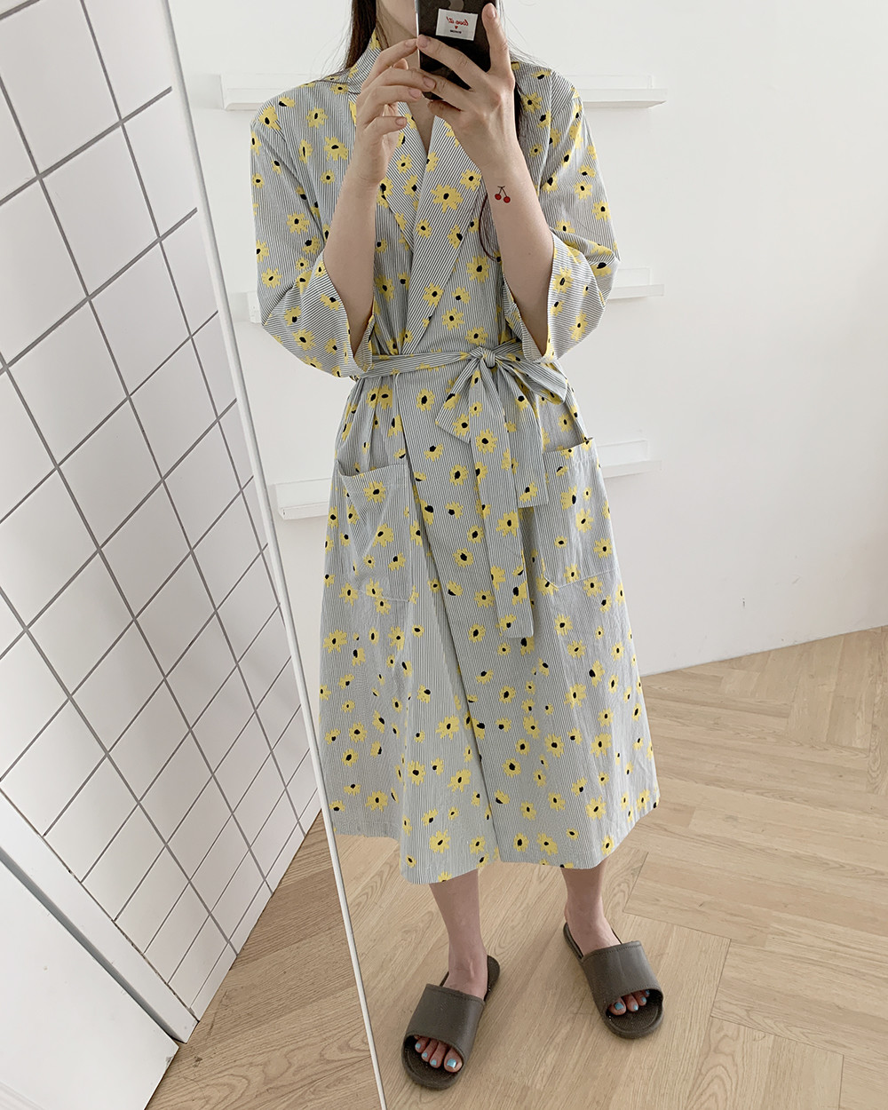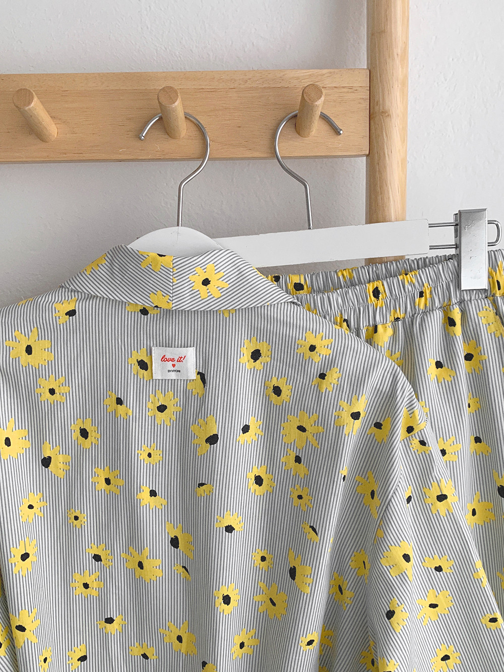 샤워하고 간단히 물기닦구 슥 입고싶었던 나의 로망.. 로브 가운 보여드려요♥♥ 앞전에 보여드린 파자마 팬츠와 같은 원단으로 세트로 연출해주셔도 좋구요 로브 그대로 클로징하여 원피스로 다양하게 활용하기 좋으실 거예요 부드럽고 보송한 면 100 소재로 피부 민감하신 분들도 아주 편안하게 입으실 수 있구요 잔잔한 스트라이프 패턴에 화사한 옐로우 플라워 패턴으로 얼굴빛을 너무 예쁘게 살려주어요 그리고 따로 롤업을 하지않아도 간편하게 세안하시거나 생활하실 수 있도록 7부 소매로 디자인 되었어요 또한 루즈한 핏으로 여리여리한 무드는 덤으로 드릴거예요 바지와 달리 좀더 탄탄한 느낌을 주기위해 덧댐 원단과 클래식한 무드의 카라디자인이 더해져 지극히 개인적으로 한여름엔 더울것 같구요 봄, 초여름, 가을 정말 활용도 높게 입기 좋아요 소장가치 높은 아이템으로 추천드릴게요 :)