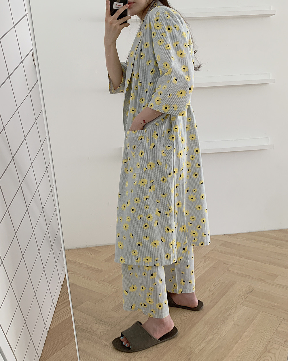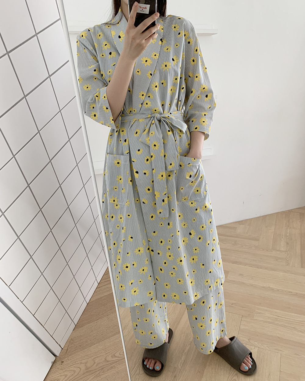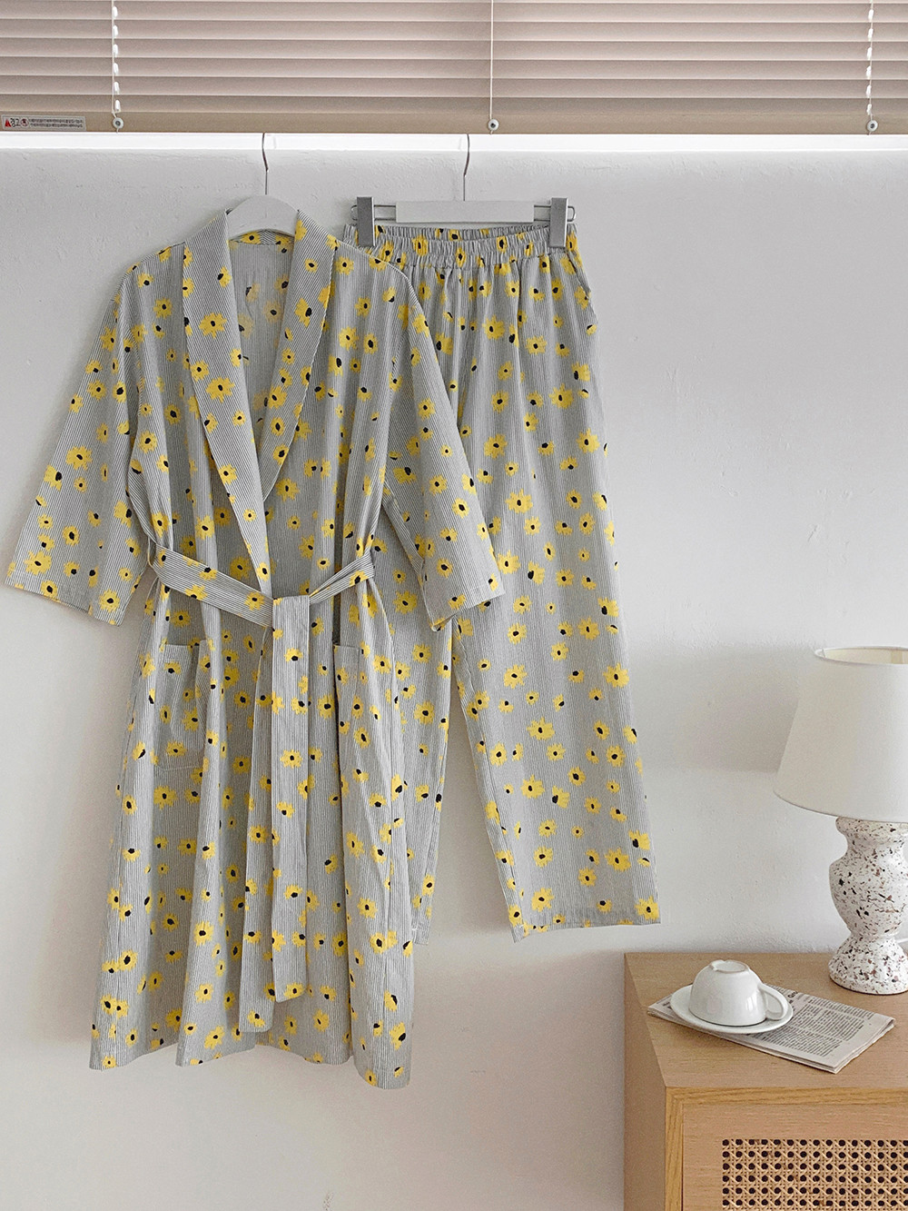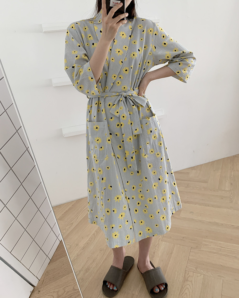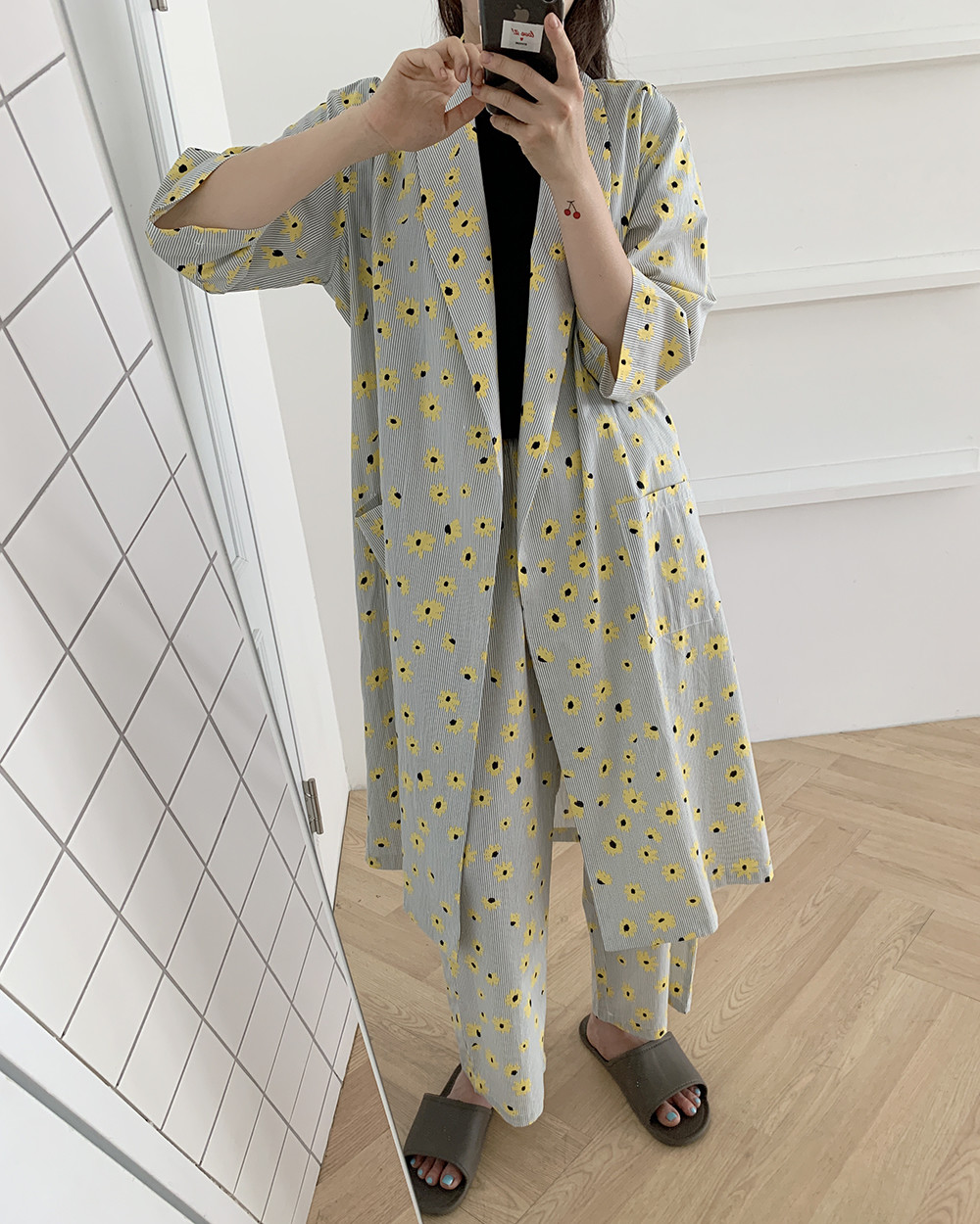 샤워하고 간단히 물기닦구 슥 입고싶었던 나의 로망.. 로브 가운 보여드려요♥♥ 앞전에 보여드린 파자마 팬츠와 같은 원단으로 세트로 연출해주셔도 좋구요 로브 그대로 클로징하여 원피스로 다양하게 활용하기 좋으실 거예요 부드럽고 보송한 면 100 소재로 피부 민감하신 분들도 아주 편안하게 입으실 수 있구요 잔잔한 스트라이프 패턴에 화사한 옐로우 플라워 패턴으로 얼굴빛을 너무 예쁘게 살려주어요 그리고 따로 롤업을 하지않아도 간편하게 세안하시거나 생활하실 수 있도록 7부 소매로 디자인 되었어요 또한 루즈한 핏으로 여리여리한 무드는 덤으로 드릴거예요 바지와 달리 좀더 탄탄한 느낌을 주기위해 덧댐 원단과 클래식한 무드의 카라디자인이 더해져 지극히 개인적으로 한여름엔 더울것 같구요 봄, 초여름, 가을 정말 활용도 높게 입기 좋아요 소장가치 높은 아이템으로 추천드릴게요 :)
