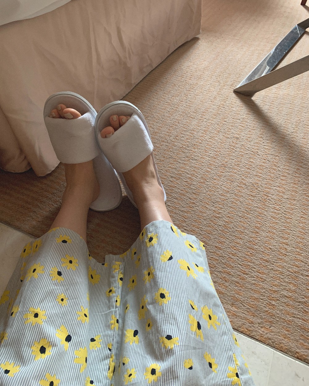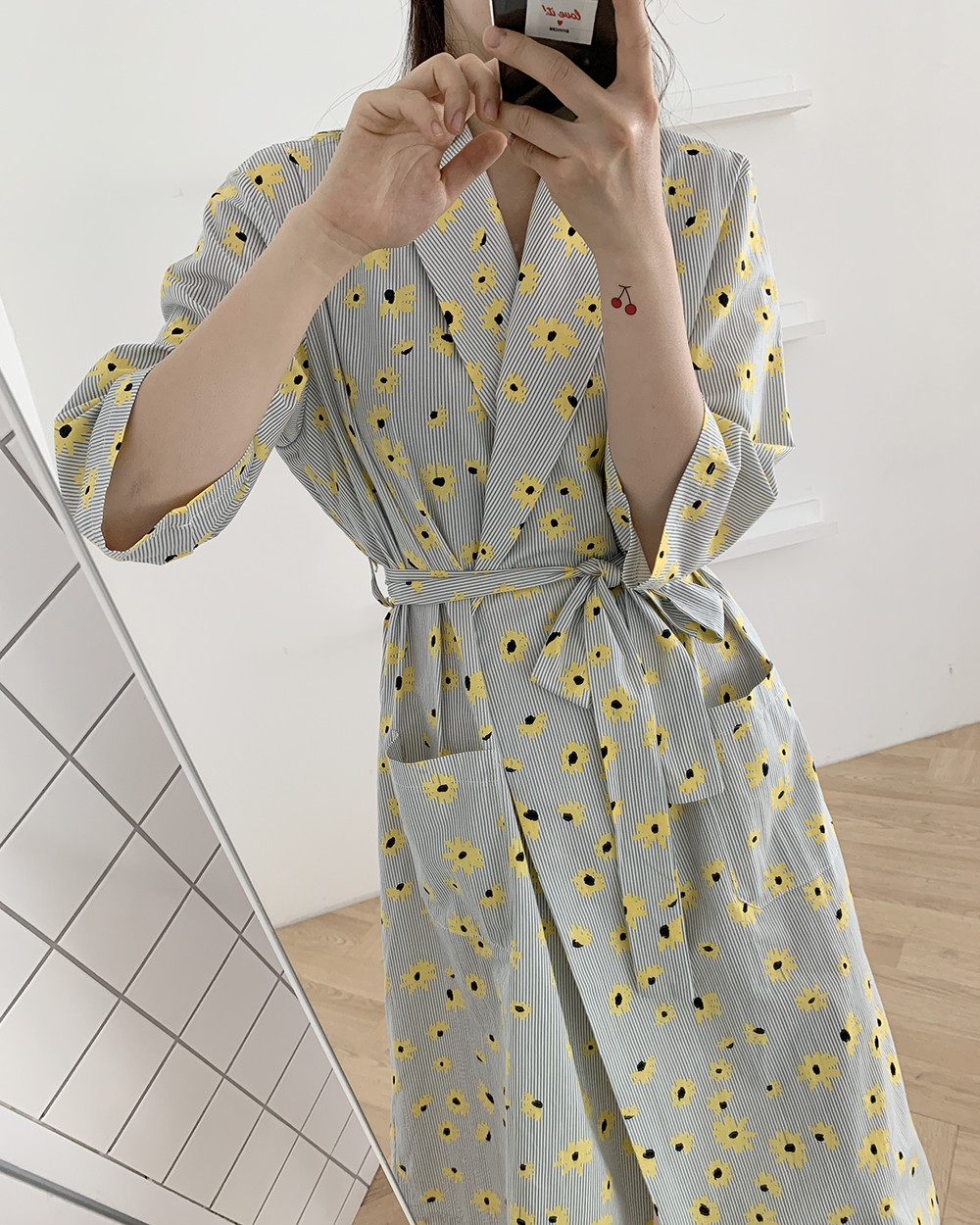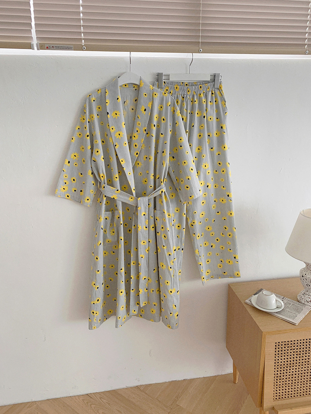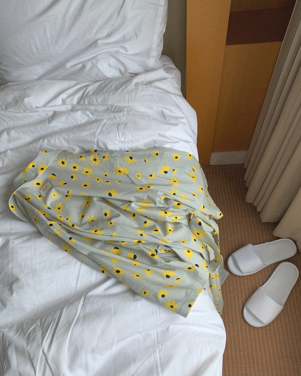 샤워하고 간단히 물기닦구 슥 입고싶었던 나의 로망.. 로브 가운 보여드려요♥♥ 앞전에 보여드린 파자마 팬츠와 같은 원단으로 세트로 연출해주셔도 좋구요 로브 그대로 클로징하여 원피스로 다양하게 활용하기 좋으실 거예요 부드럽고 보송한 면 100 소재로 피부 민감하신 분들도 아주 편안하게 입으실 수 있구요 잔잔한 스트라이프 패턴에 화사한 옐로우 플라워 패턴으로 얼굴빛을 너무 예쁘게 살려주어요 그리고 따로 롤업을 하지않아도 간편하게 세안하시거나 생활하실 수 있도록 7부 소매로 디자인 되었어요 또한 루즈한 핏으로 여리여리한 무드는 덤으로 드릴거예요 바지와 달리 좀더 탄탄한 느낌을 주기위해 덧댐 원단과 클래식한 무드의 카라디자인이 더해져 지극히 개인적으로 한여름엔 더울것 같구요 봄, 초여름, 가을 정말 활용도 높게 입기 좋아요 소장가치 높은 아이템으로 추천드릴게요 :)