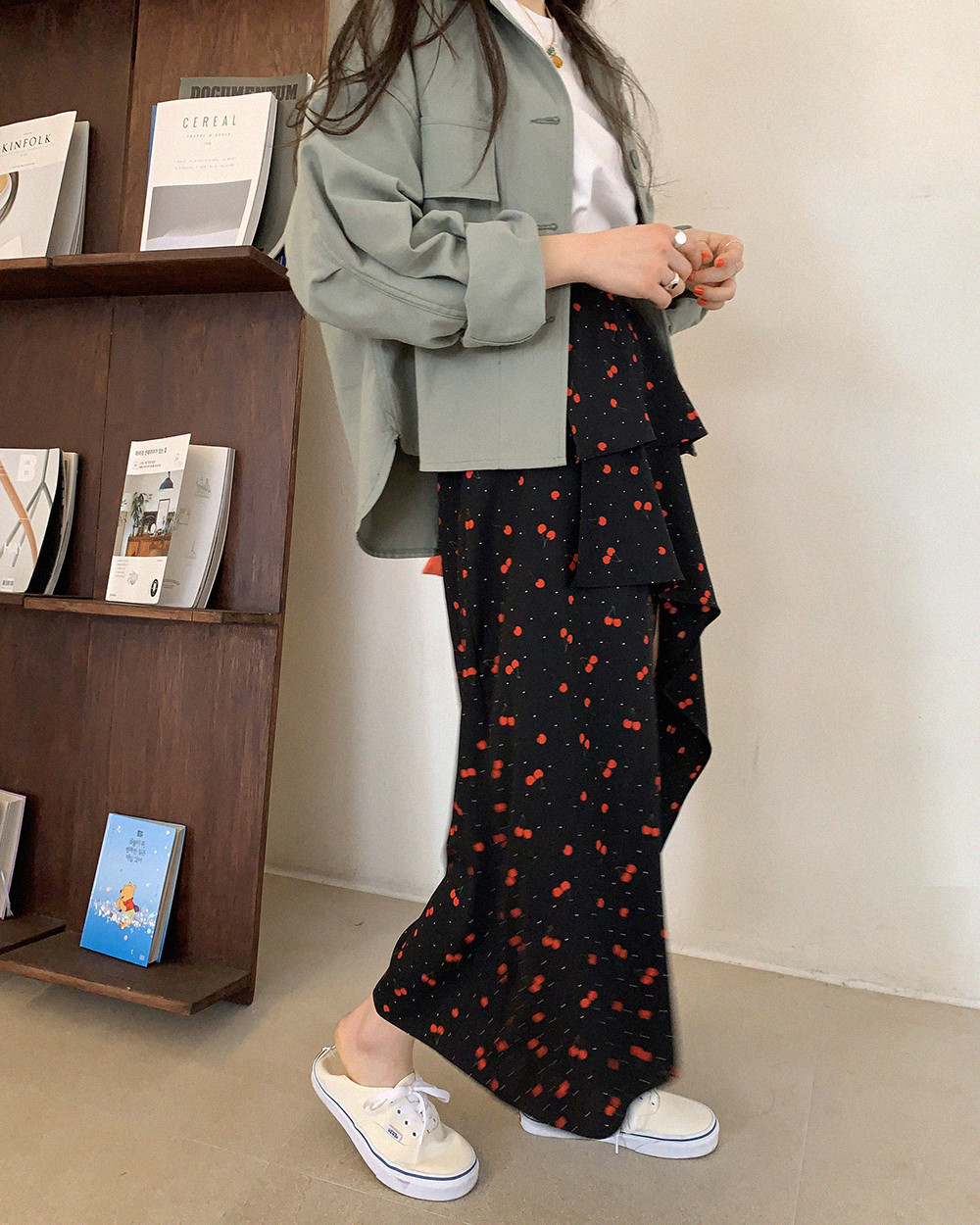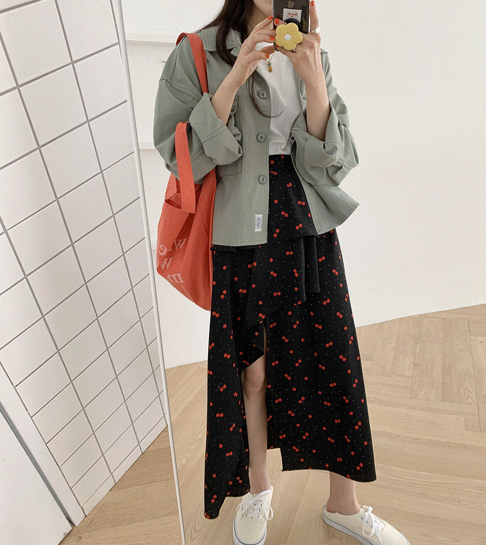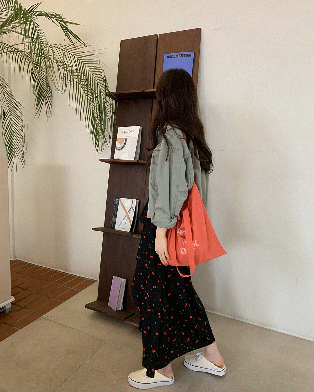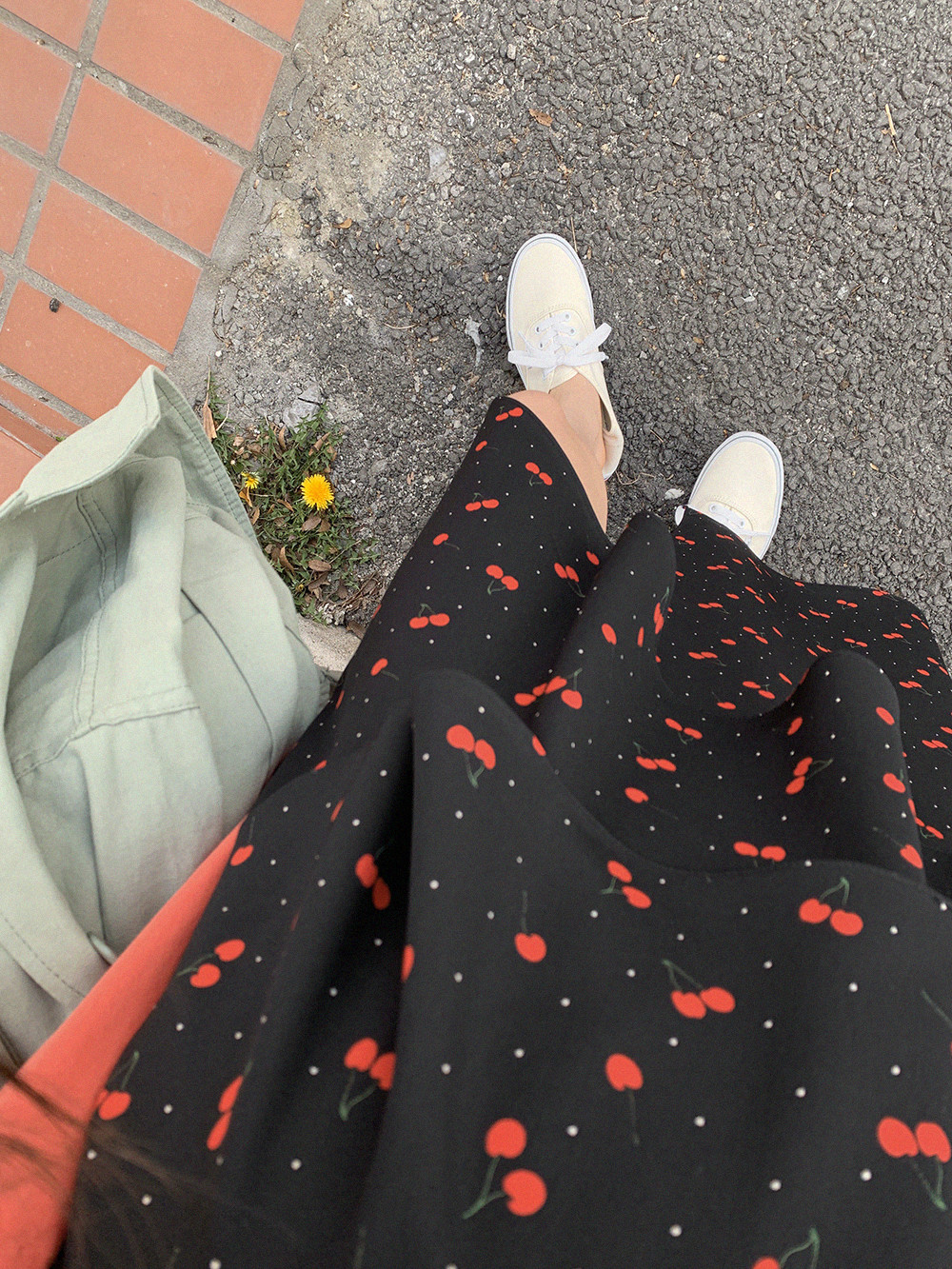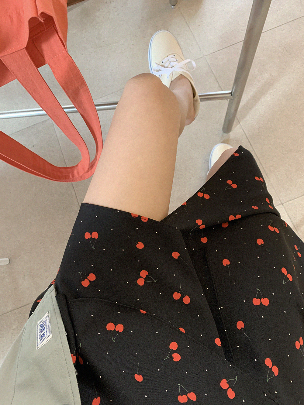 짧은치마는 입고싶지만 나이 서른짤 넘고부터 잘 입질 못하겠고.. 롱롱이는 포기못하고 그리하여 만들게된 언발란스 스커트예요! 차르르 떨어지는 부드러운 폴리소재로 착용감이 너무 좋구요, 여유있는 핏으로 군살들을 가려주면서도 슬쩍이 보이는 다리라인으로 살빠졌니?소리 들을법한 아주 매력적인 아이예요 화사한 토마토레드컬러의 체리패턴으로 아주그냥 러블리하게 연출되구요 허리 뒷밴딩으로 안정감있게 잡아준답니다 스커트 자체만으로도 너무 예뻐서 기본 흰티에다가만 입어주어도 코디끝~~ 저처럼 야상자켓이나 심플한 맨투맨, 니트 등과 함께 다양하게 즐겨주세요 :)