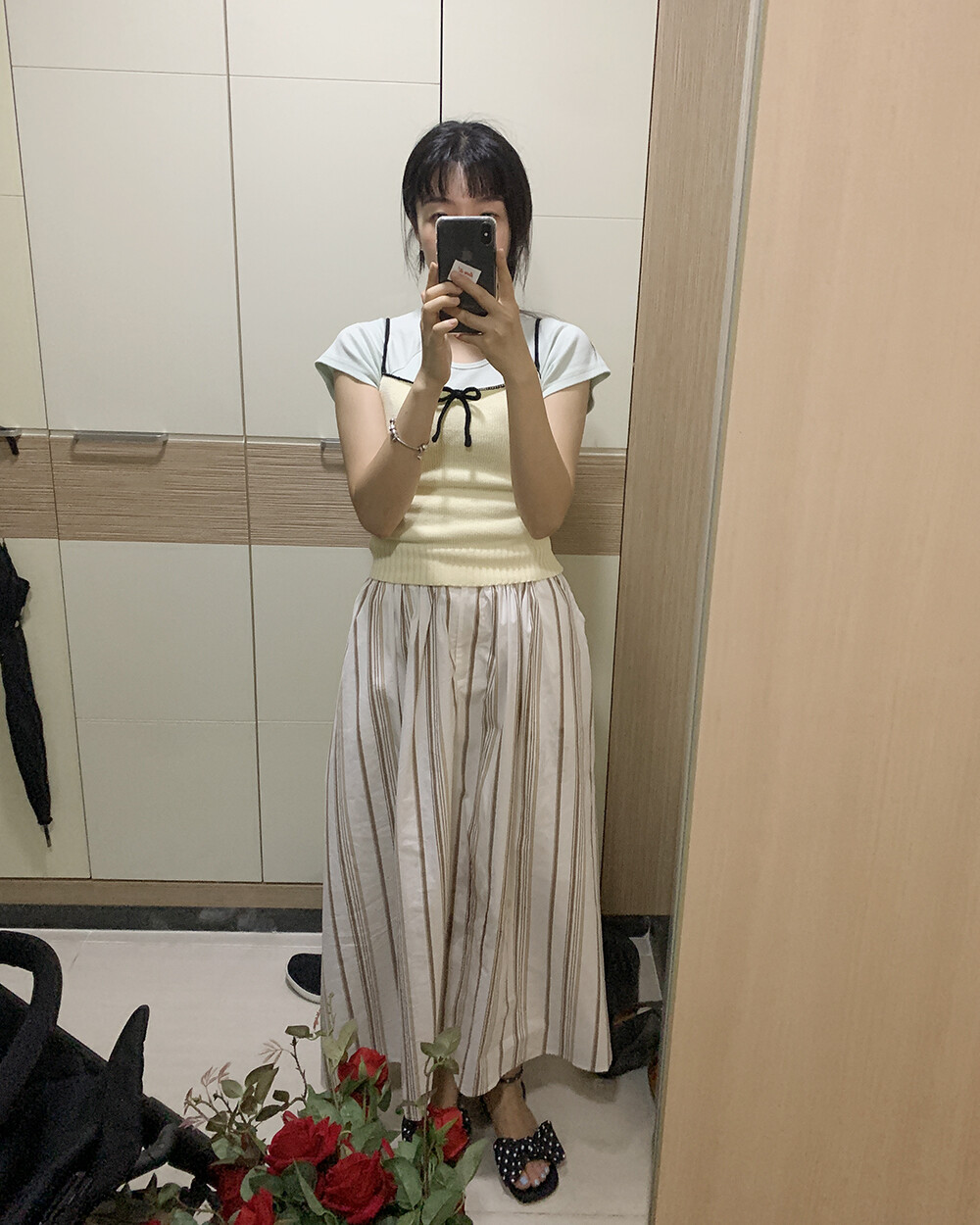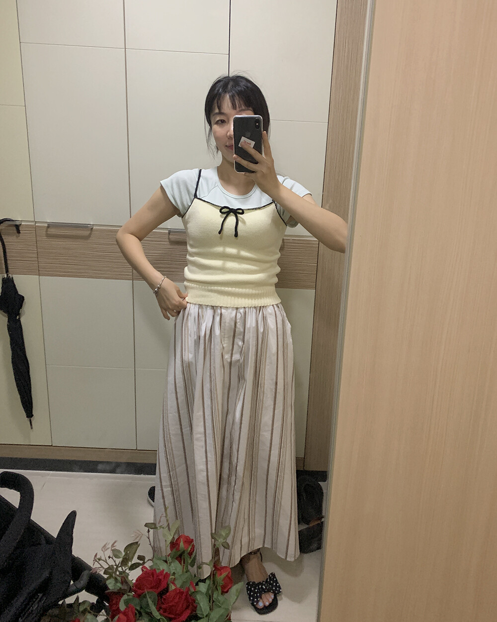 신축성 좋음 / 두께 얇음 / 비침 약간 / 안감 없음
