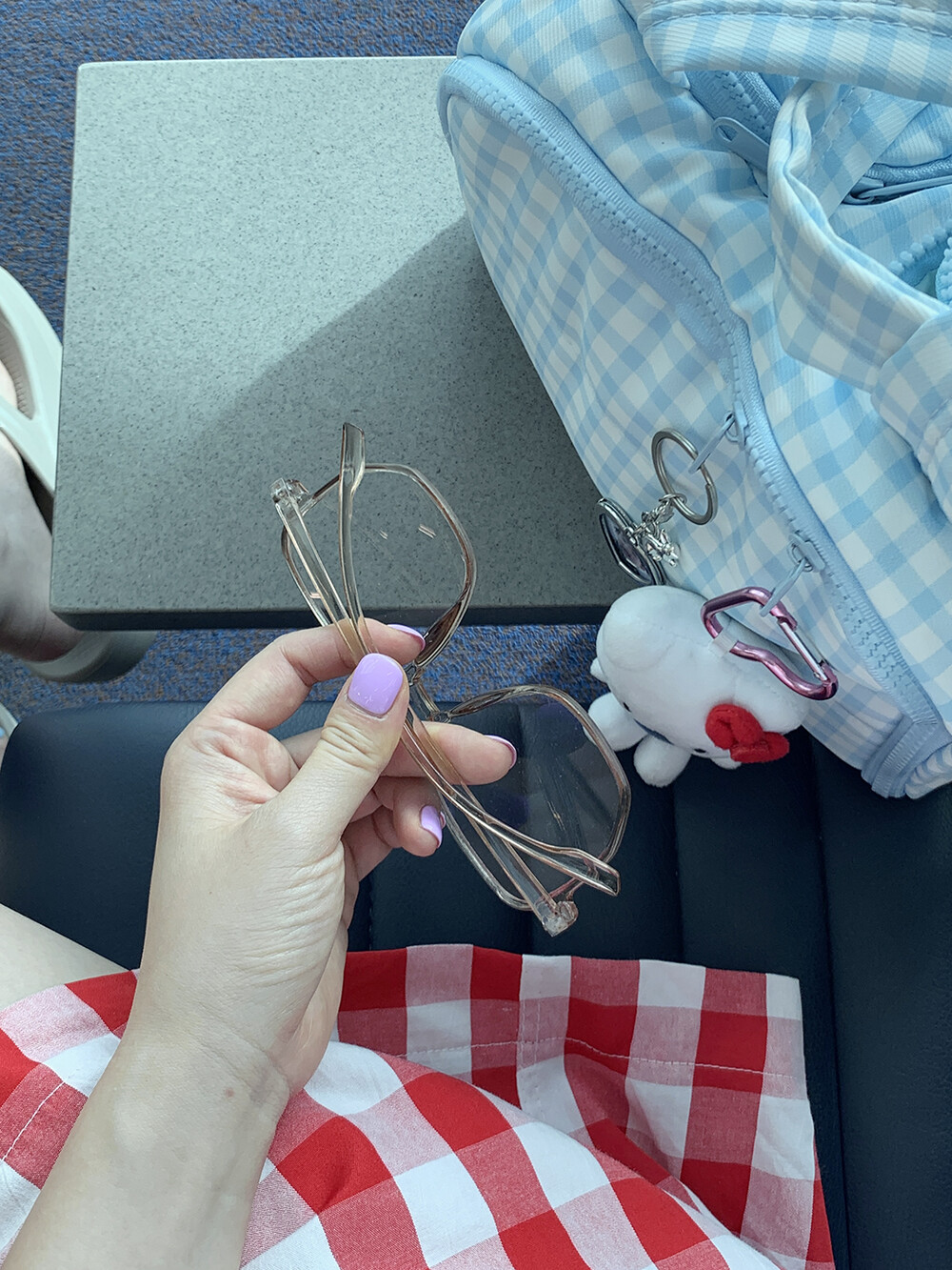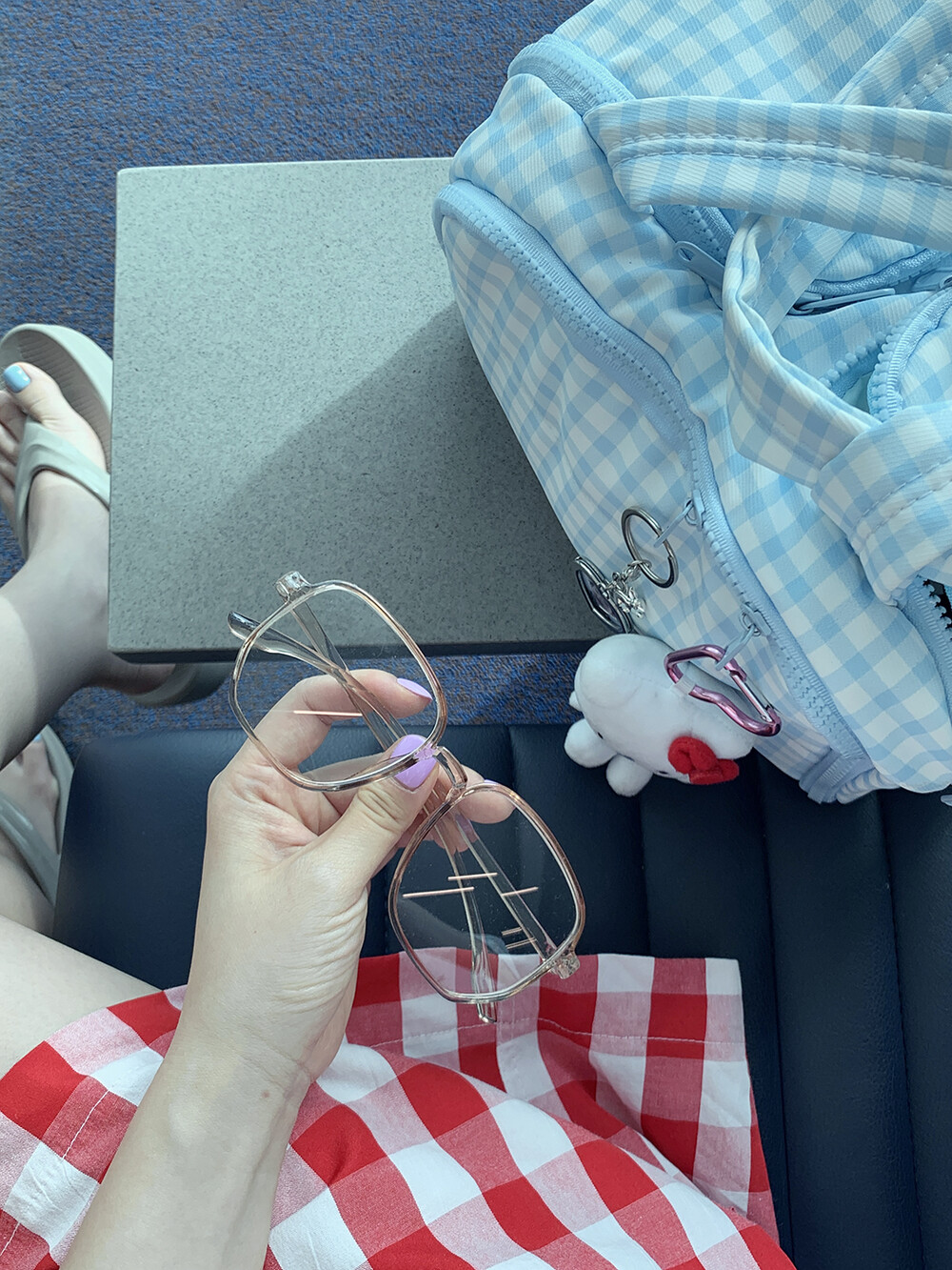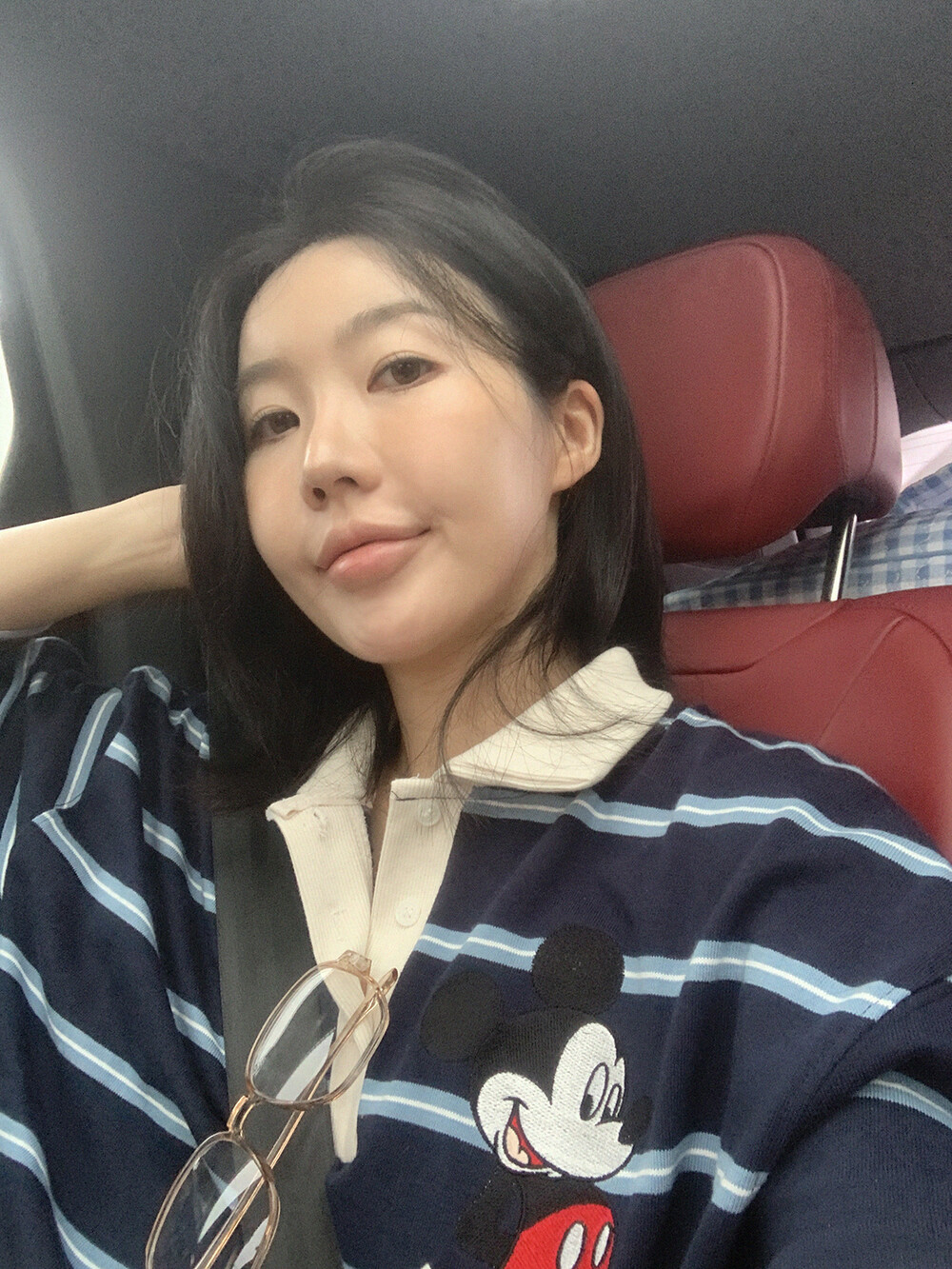 투명한 라이트 브라운 컬러의 프레임이 얼굴을 환하게 밝혀주며